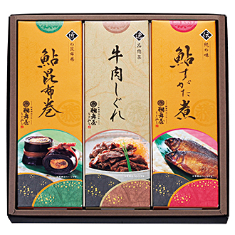 商品内容 鮎昆布巻190g、牛肉しぐれ70g、鮎すがた煮75g