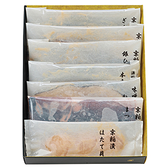 商品内容 京粕漬(ぎんだら・銀鮭・銀ひらす・まついか(小)各1、ほたて貝×3)、酒粕白味噌漬(本さわら)・味噌漬(かれい)各1