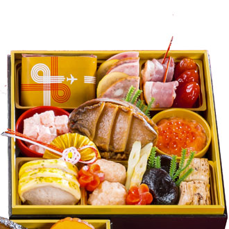 新年の初めに美味しいものを食べて幸せに満たされていただきたいという思いを込め、素材ひとつ一つにこだわり詰め合わせております。各お重には、羽田空港を感じていただけるような飛行機のデザインのあしらいも施しております。