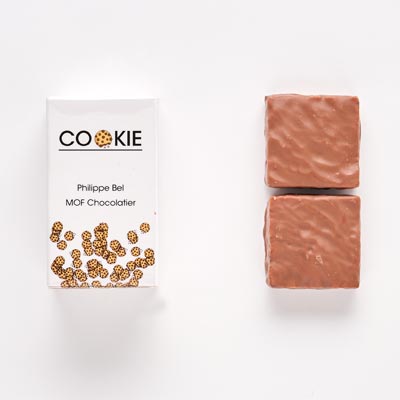 チョコレートチップやヘーゼルナッツが入ったクッキーをミルクチョコレートでコーティングしました。四角形になりました。