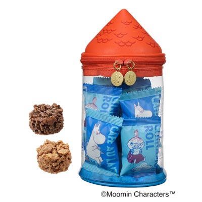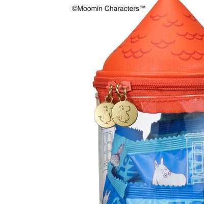 取り外し可能なストラップがついた、「吊るせる」「飾れる」2WAY仕様。ムーミンやしきをイメージしたポーチは中に入れるもので印象が変わり様々な楽しみ方が広がります。中にはカフェオレとシナモンロールをイメージしたクランチチョコレート入り。
